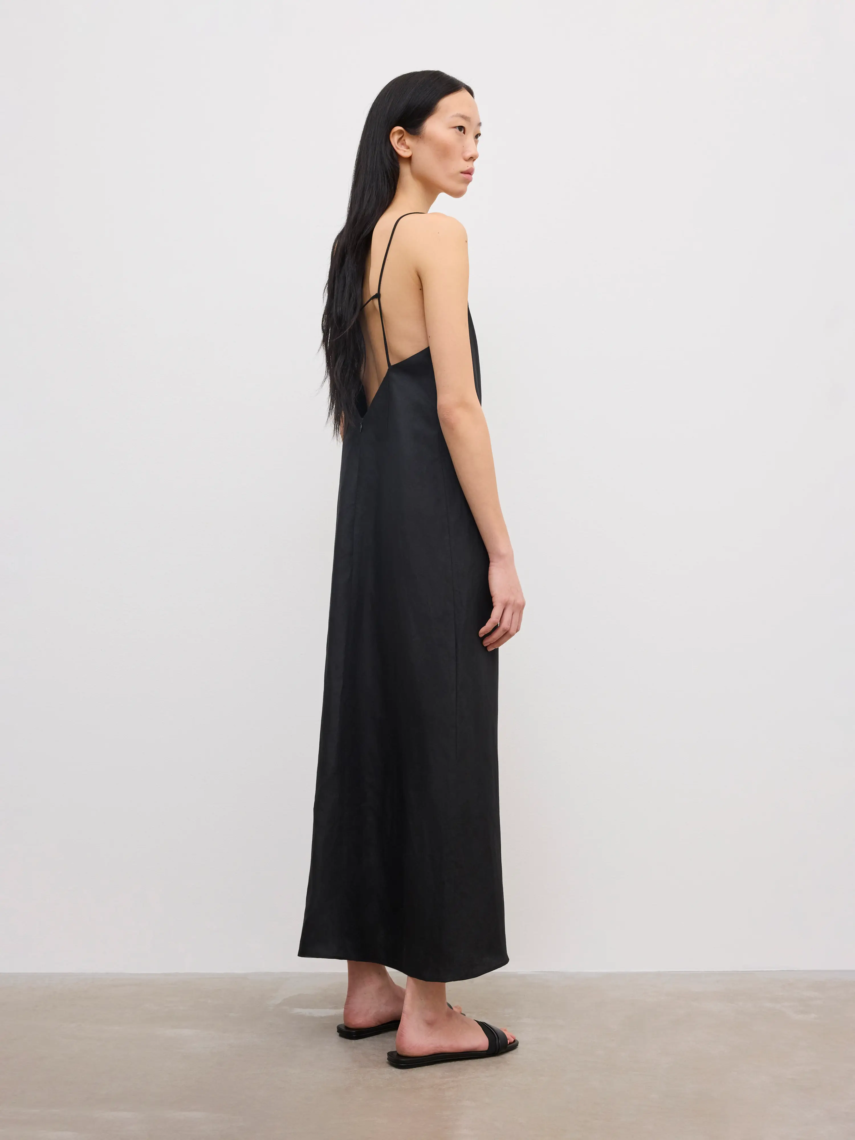 Mid-length dress in a fluid linen blend, cut to a straight silhouette. Characterised by a waterfall drape at the front and a sensual deep V at the back. Finished with a concealed side zip. Fully lined.